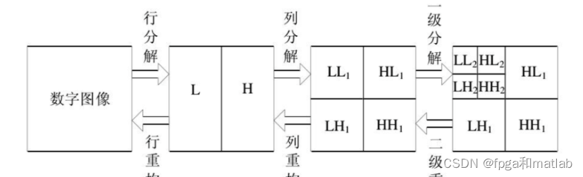 图像的二维离散小波分解和重构过程如下图所示,分解过程可描述为:首先对图像的每一行进行 1D-DWT,获得原始图像在水平方向上的低频分量 L 和高频分量 H,然后对变换所得数据的每一列进行 1D-DWT,获得原始图像在水平和垂直方向上的低频分量 LL、水平方向上的低频和垂直方向上的高频 LH、水平方向上的高频和垂直方向上的低频 HL 以及水平和垂直方向上的的高频分量 HH。